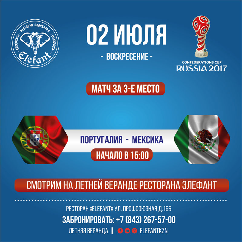 Не пропустите трансляции матчей Кубка Конфедераций в ресторане Elefant! Начало трансляции в 18:00.